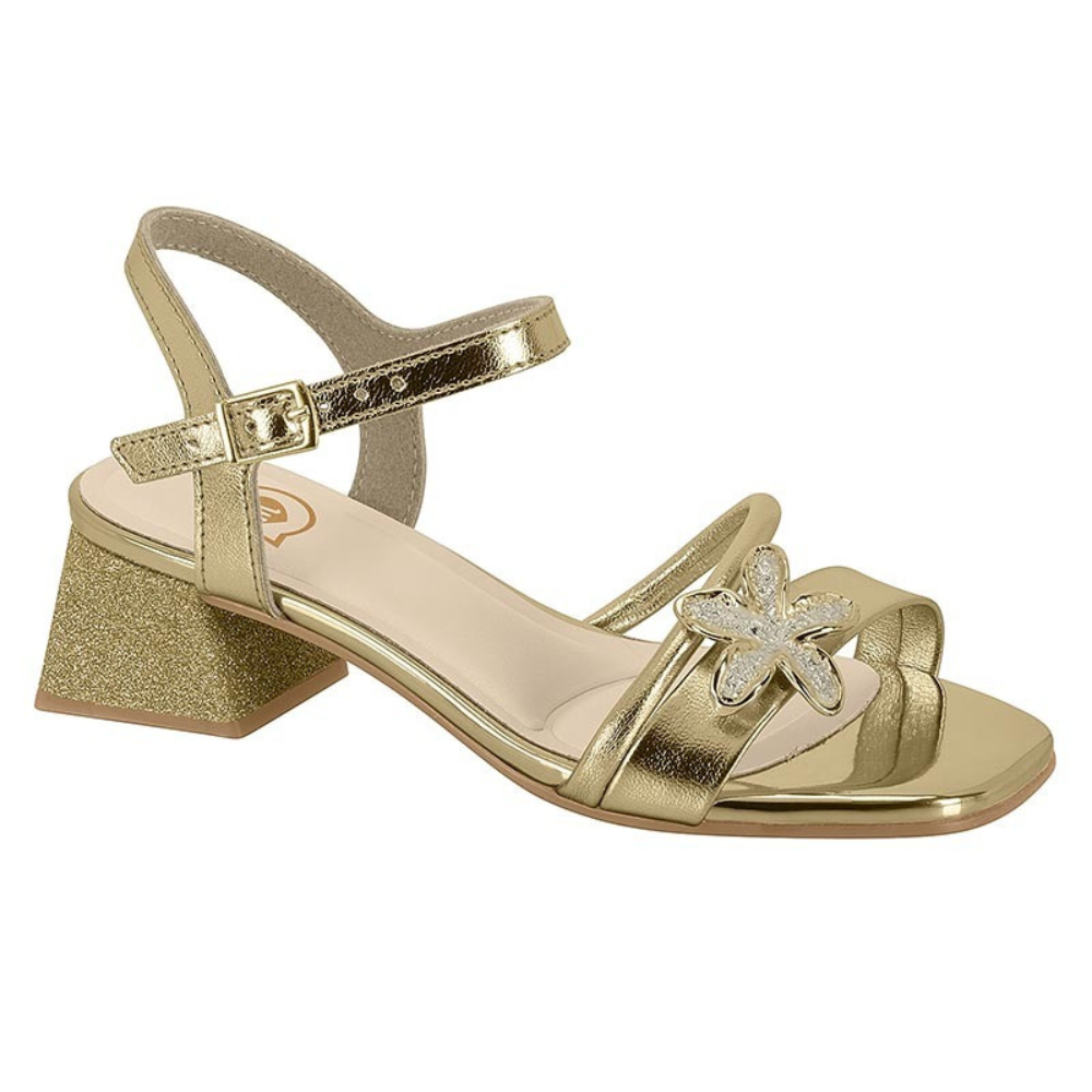 Sandália Infantil Salto Detalhe Flor Molekinha. Encanto e brilho se destacam com detalhe Geométrico de Flor Metalizada Ouro. O design delicado é valorizado pela flor reluzente e pelo acabamento dourado, que iluminam qualquer look. O salto geométrico oferece conforto e estabilidade, enquanto a fivela ajustável garante ajuste perfeito. Uma opção graciosa e elegante para acompanhar vestidos ou saias leves, tornando cada passo ainda mais especial.